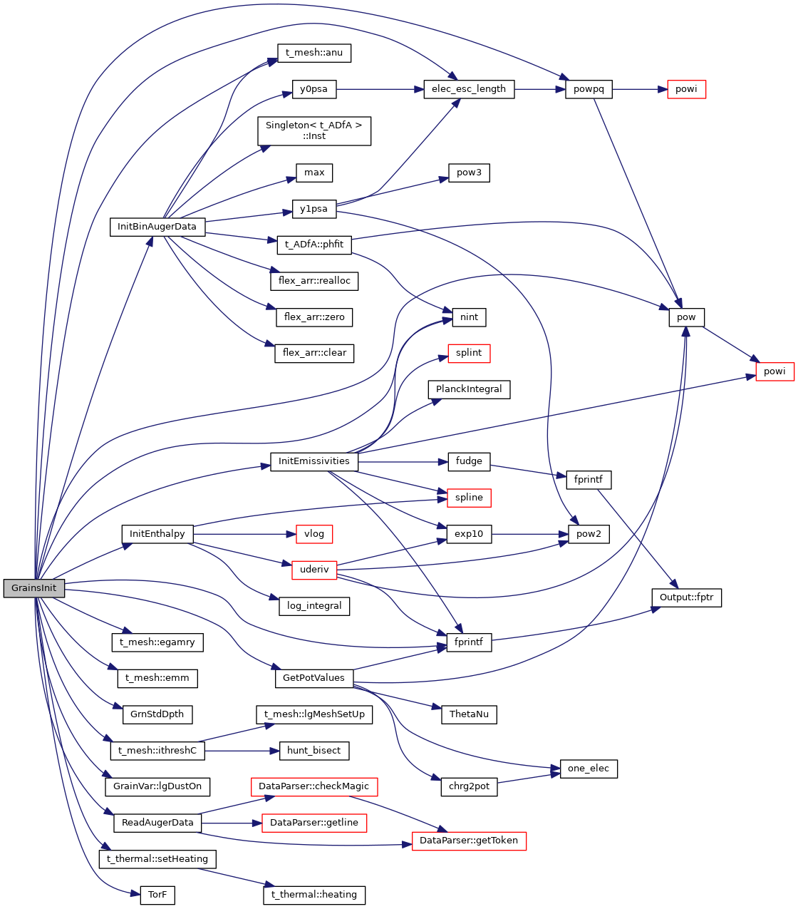 References t_mesh::anu(), ASSERT, atoms, GrainVar::AugerData, AEInfo::AvNumber, GrainVar::bin, cdEXIT, t_elementnames::chElementName, CHRG_TOLER, t_thermal::ConstGrainTemp, conv, DEBUG_ENTRY, dense, DF_STANDARD, GrainVar::dstab, GrainVar::dstsc, t_conv::EdenErrorAllowed, t_mesh::egamry(), elec_esc_length(), elementnames, GrainVar::elmSumAbund, t_mesh::emm(), ENABLE_QUANTUM_HEATING, AEInfo::Energy, EXIT_FAILURE, fprintf(), t_dense::gas_phase, GrainVar::GasCoolColl, GetPotValues(), GrainVar::GrainEmission, GrainVar::GrainHeatCollSum, GrainVar::GrainHeatDif, GrainVar::GrainHeatInc, GrainVar::GrainHeatLya, GrainVar::GrainHeatSum, GrainVar::GrainMetal, GrainVar::GraphiteEmission, GrainVar::GrnRecomTe, GrnStdDpth(), gv, HEAT_TOLER, HEAT_TOLER_BIN, t_conv::HeatCoolRelErrorAllowed, INCL_TUNNEL, InitBinAugerData(), InitEmissivities(), InitEnthalpy(), AEInfo::IonThres, ioQQQ, ipHYDROGEN, ipLITHIUM, t_mesh::ithreshC(), GrainVar::lgAnyDustVary, t_trace::lgDustBug, GrainVar::lgDustOn(), GrainVar::lgQHeatAll, GrainVar::lgQHeatOn, t_trace::lgTrace, GrainVar::lgWD01, LIMELM, MAT_PAH, MAT_PAH2, MAX2, NCHU, AEInfo::nData, t_rfield::nflux_with_check, nint(), t_rfield::nPositive, AEInfo::nSubShell, GrainVar::nzone, pow(), POW2, powpq(), ReadAugerData(), rfield, t_thermal::setHeating(), GrainVar::SilicateEmission, STICK_ELEC, thermal, TorF(), trace, GrainVar::which_zmin, ZMIN_CAR, and ZMIN_SIL.