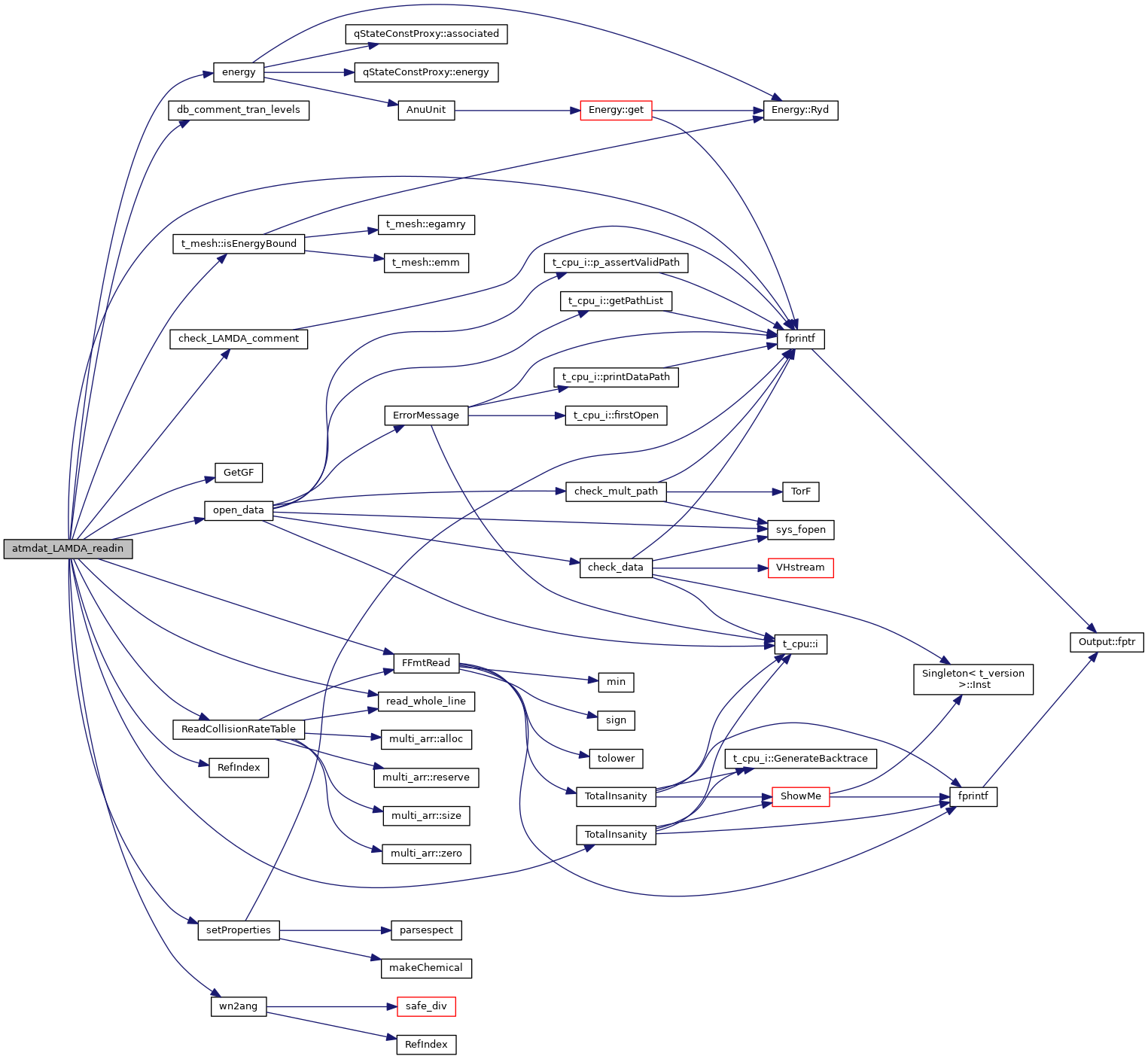 References ASSERT, atmdat, AtmolCollRateCoeff, cdEXIT, check_LAMDA_comment(), db_comment_tran_levels(), dBaseSpecies, dBaseStates, dBaseTrans, DEBUG_ENTRY, DEBUGSTATE, energy(), EXIT_FAILURE, FFmtRead(), fprintf(), GetGF(), ioQQQ, ipATOM_H, ipATOM_HE, ipdBaseTrans, ipELECTRON, ipH2, ipH2_ORTHO, ipH2_PARA, ipNCOLLIDER, t_mesh::isEnergyBound(), isnan, t_atmdat::lgLamdaPrint, MIN3, t_atmdat::nLamdaMaxLevels, open_data(), read_whole_line(), ReadCollisionRateTable(), RefIndex(), rfield, setProperties(), TotalInsanity(), and wn2ang().